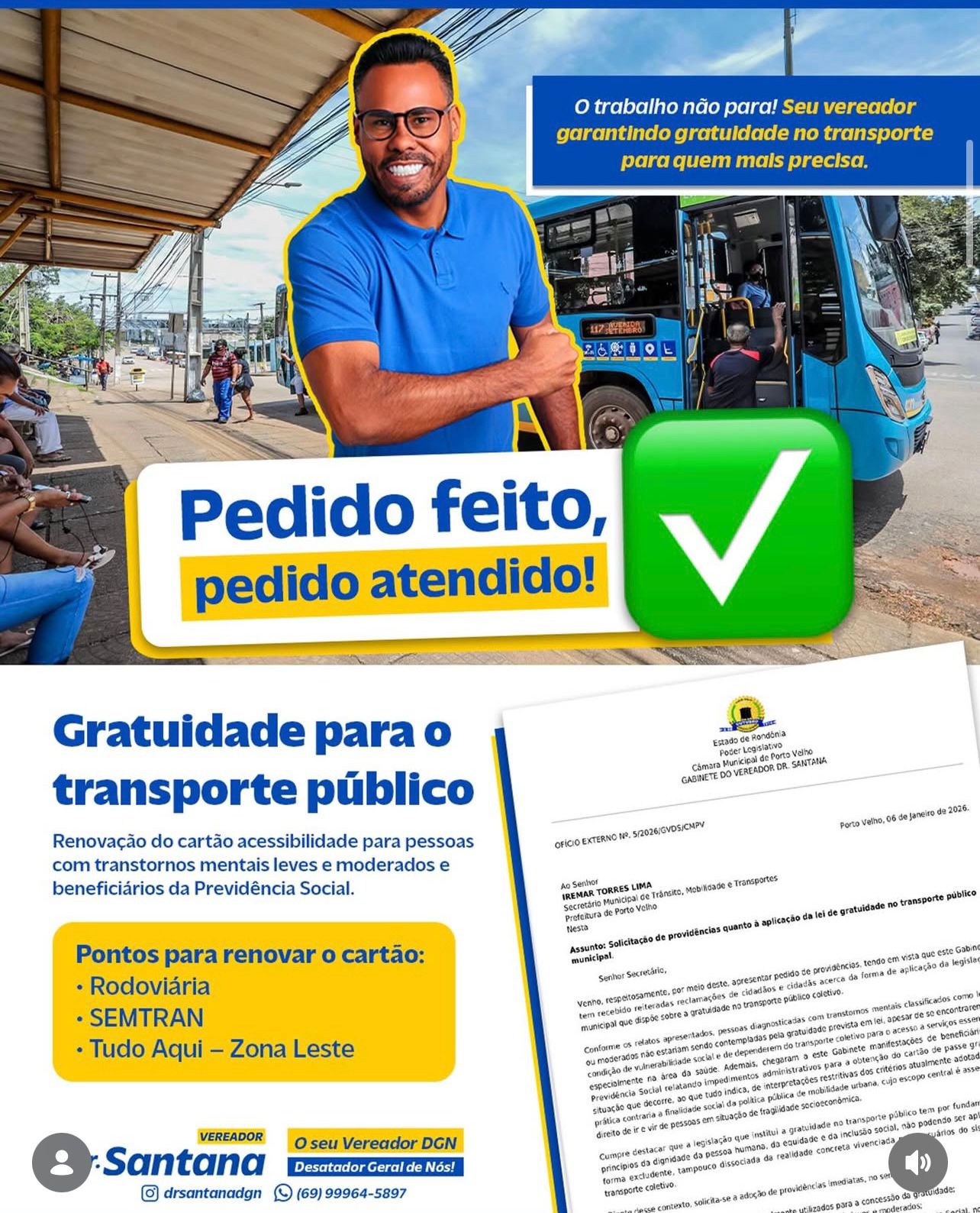 Após ouvir as demandas da população, o vereador Dr. Santana obteve uma importante conquista para a mobilidade e inclusão social em Porto Velho. O pedido encaminhado ao secretário municipal de Trânsito, Iremar Torres Lima, sobre a gratuidade no transporte público foi atendido.